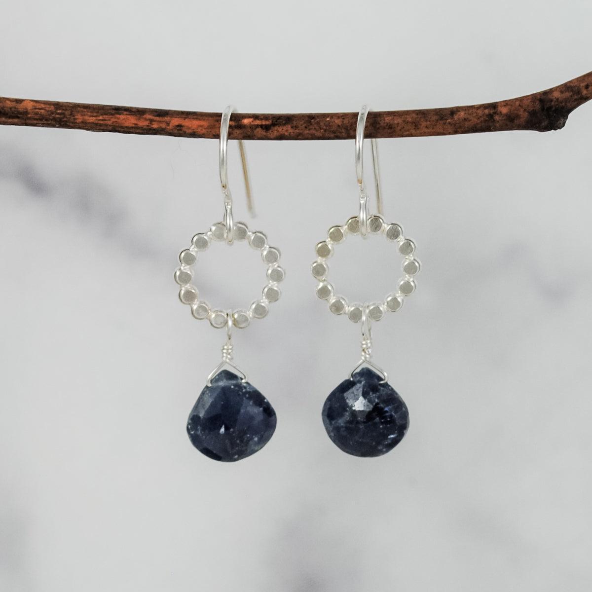 Sterling silver or 14 karat gold-filled and dark blue sapphire stones.