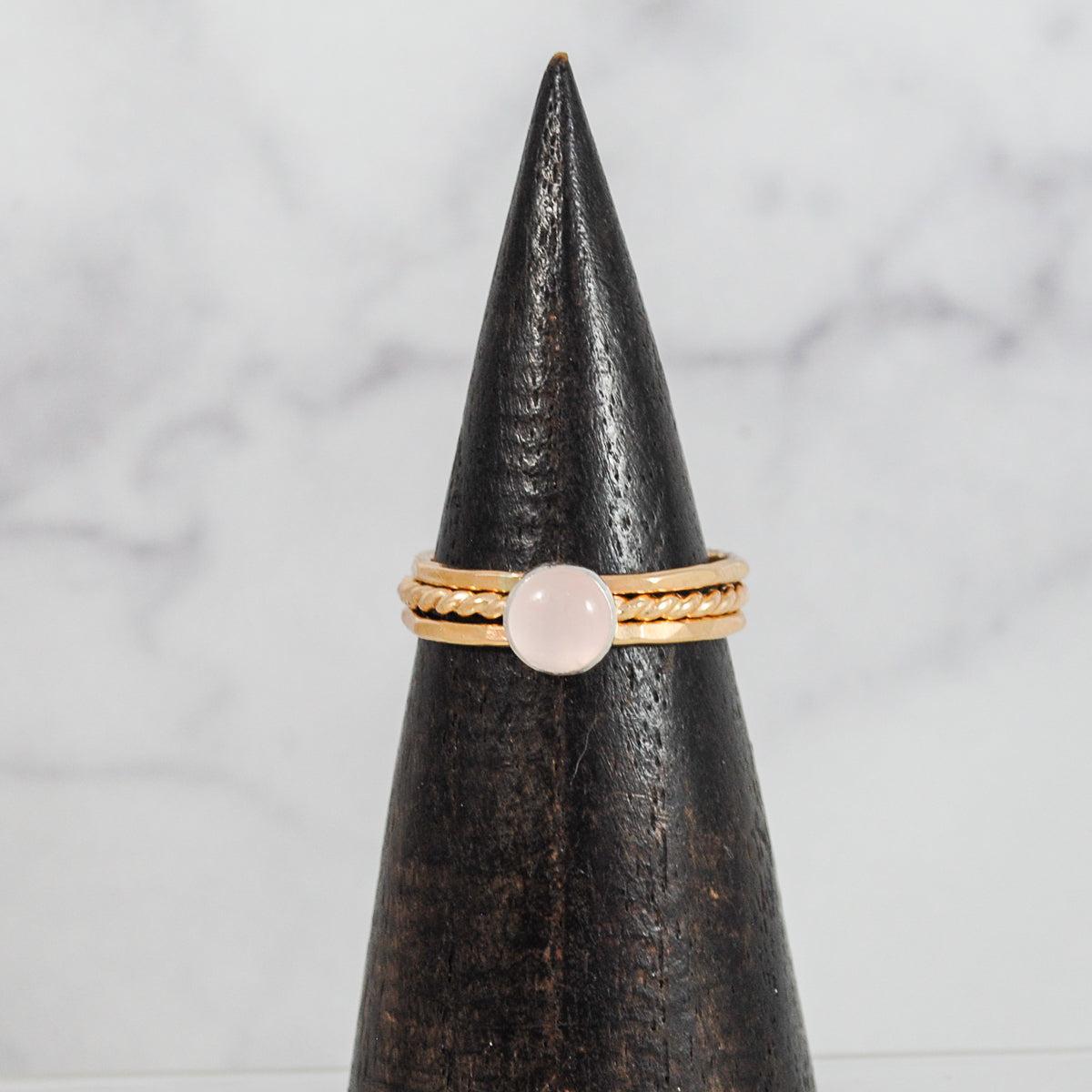 More is more when it comes to stacking rings, especially with a captivating mix of textures. This trio of rings alternates two hammered bands with a single twisted band punctuated with a statement stone. Choose a unique metal/gem combo that lets your finger do the talking.
