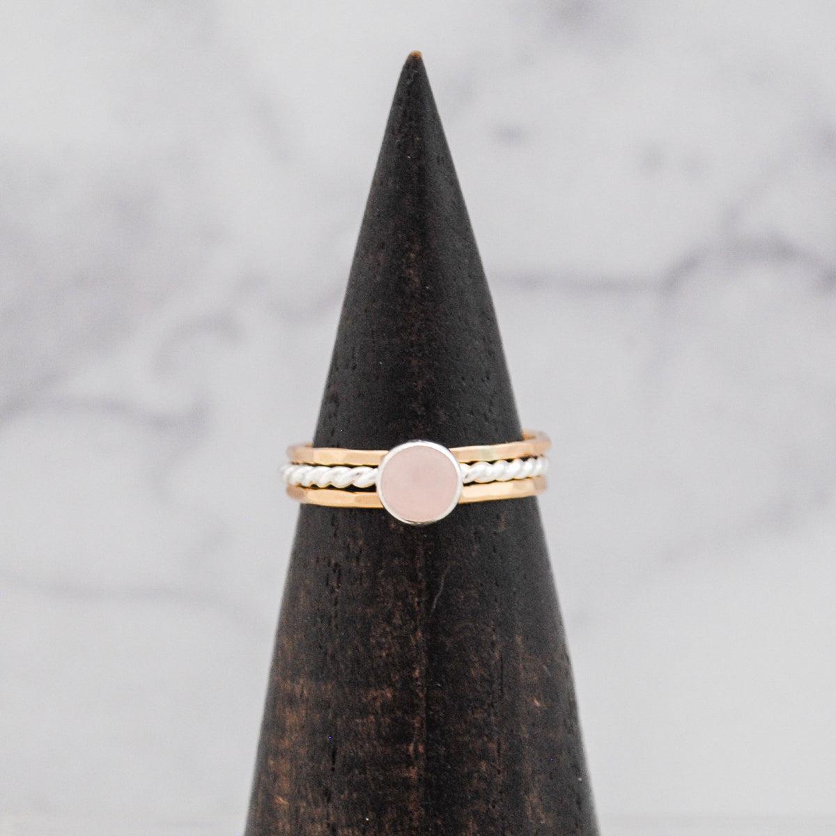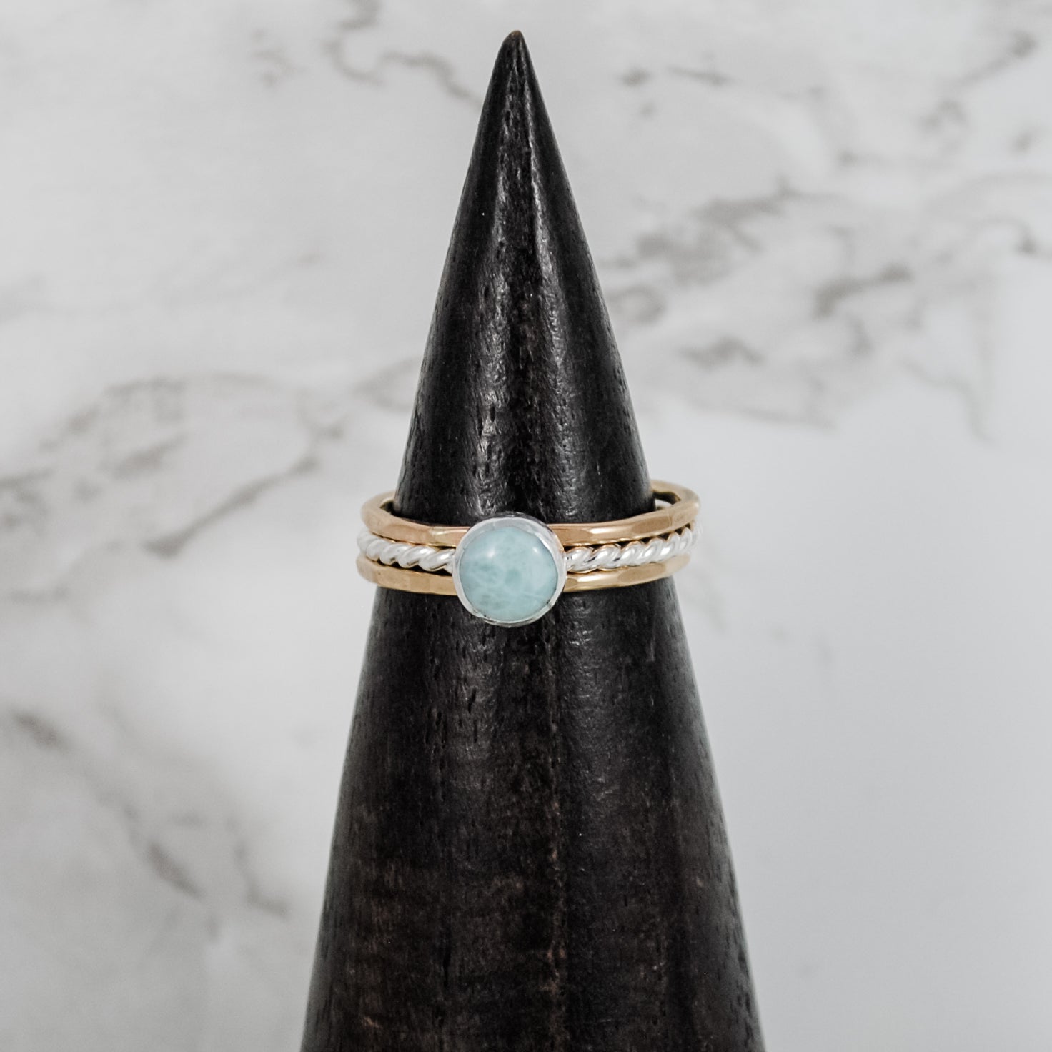 More is more when it comes to stacking rings, especially with a captivating mix of textures. This trio of rings alternates two hammered bands with a single twisted band punctuated with a statement stone. Choose a unique metal/gem combo that lets your finger do the talking.